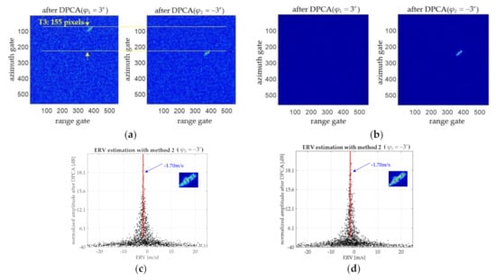 SAR images and ERV results of T3 with squint angle and : (a) SAR images before clutter suppression; (b) SAR images after clutter suppression; (c) ERV result before refocusing; (d) ERV result after refocusing.