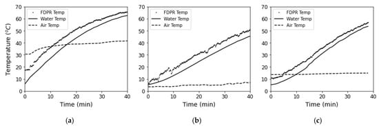 FDPR and thermistor measured water bath temperature at different ambient air temperatures: (a) high ambient air temperature; (b) low ambient air temperature; (c) mid ambient air temperature (room temperature).