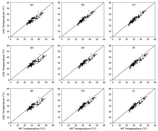 Comparison of surface temperature measurements from UAS FDPR thermal camera and field IRTs at different correction levels: (a) non-corrected IRT and UAS FDPR; (b) non-corrected IRT and emissivity corrected UAS FDPR; (c) non-corrected IRT and atmospherically corrected UAS FDPR; (d) emissivity corrected IRT and non-corrected UAS FDPR; (e) emissivity corrected IRT and UAS FDPR; (f) emissivity corrected IRT and atmospherically corrected UAS FDPR; (g) atmospherically corrected IRT and non-corrected UAS FDPR; (h) atmospherically corrected IRT and emissivity corrected UAS FDPR; (i) atmospherically corrected IRT and UAS FDPR.