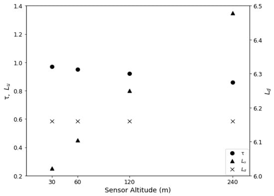 Modeled Lu, Ld and τ at the UAS scene center time on 9 August 2018 at different sensor altitudes.