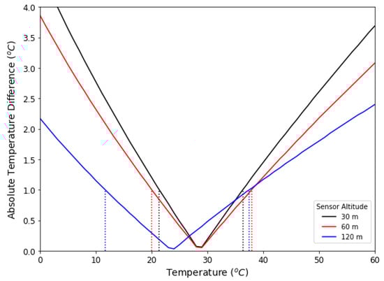 Absolute temperature differences in atmospherically corrected thermal imagery collected at 240 m AGL and thermal imagery collected at 30 m, 60 m and 120 m AGL based on MODTRAN modeled atmospheric interference on 9 August 2018. Vertical dashed lines represent a potential one-degree Celsius error for each sensor altitude compared to atmospherically corrected thermal imagery collected at 240 m AGL.
