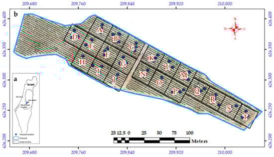 The study site: (a) vineyard location within Israel; and (b) Mevo-Beitar experimental vineyard. Management cells are represented in black squares with different English alphabet letters (n = 20). Measurement vines are marked as blue dots (n = 120), and yield-monitored vines (n = 240) as blank open circles.