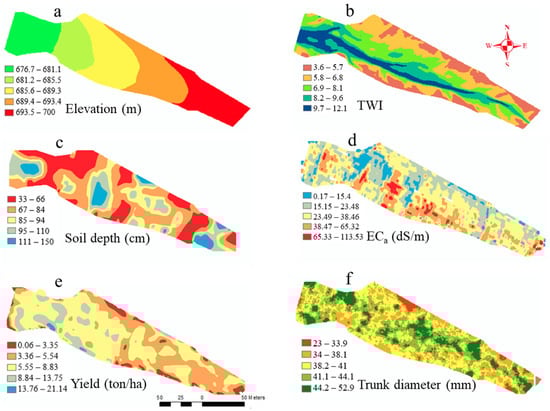 Spatial maps of (a) elevation (masl), (b) topographic wetness index (TWI), (c) soil depth (cm), (d) apparent electrical conductivity (ECa) at 0–75 cm depth, (e) yield from 2017 (ton/ha) and (f) trunk diameter (mm).