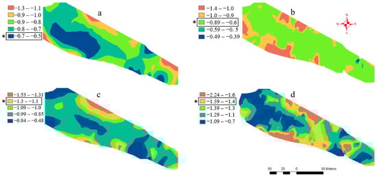 Maps of Ψstem (MPa) on 4 measurement days: (a) fruit set 23 May 2018; (b) bunch closure 20 June 2018; (c) veraison 4 July 2018 and (d) harvest 29 August 2018. Target Ψstem values for each date are shown in brackets.