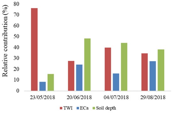 Relative contribution of soil and terrain variables to Ψstem at fruit set (23 May 2018), bunch closure (20 June 2018), veraison (4 July 2018) and harvest (29 August 2018). RMSE ranged between 0.06 at early season and 0.18 at the end of season. TWI is topographical wetness index and ECa is apparent electrical conductivity.