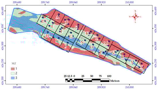 Vineyard delineation into three management zones (MZs) based on topographical wetness index: MZ1 (red), MZ2 (green) and MZ3 (blue). Management cells are represented by black squares with different letters. Measurement vines are marked as blue dots.