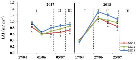 Seasonal course of leaf area index (LAI) of vines in the management zones (MZs) during 2017 and 2018. Each point is the mean of 44, 56 and 20 vines for MZ 1, 2 and 3, respectively ± SE. Asterisks represent significant differences among MZs using ANOVA (α = 0.05).