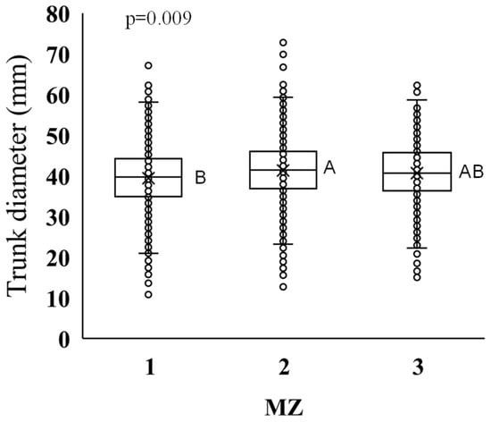 Boxplots presenting the distribution of trunk diameter of vines in the three management zones (MZs), as measured in January 2017. Different letters indicate significant differences as analyzed by ANOVA (α = 0.05).