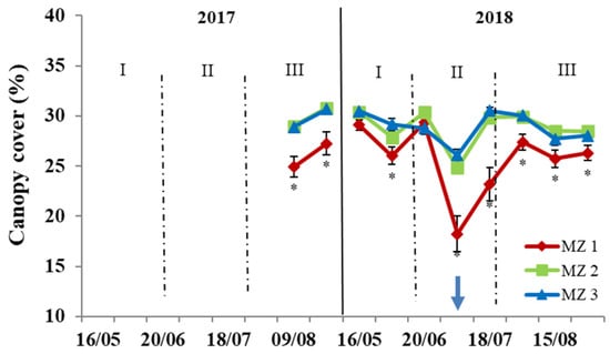 Seasonal course of canopy cover of the vines in the management zones (MZs) during 2017 and 2018. Measurement was conducted first by calculating NDVI in vine rows, then calculating the canopy coverage of every MZ. Each point is the mean of 22 random points created to account for spatial autocorrelation. The blue arrow indicates date of canopy trimming. Asterisks represent significant differences among MZs using ANOVA (α = 0.05).