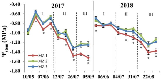 Seasonal course of midday stem water potential (Ψstem) of vines in the management zones (MZs) during 2017 and 2018. Each point is the mean of 44, 56 and 20 vines for MZ 1, 2 and 3, respectively ± SE. Asterisks represent significant differences among MZs as determined by ANOVA (α = 0.05).