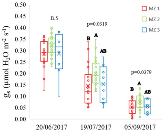 Stomatal conductance to water vapor (gs) on three days, representing different phenological stages: 20 June 2017—bunch closure, 19 July 2017—veraison and 5 September 2017—harvest. Data were measured in the western block (MCs A–J) around solar noon. Steel–Dwass test was performed in 20 June 2017. In other cases, significant differences among MZs were evaluated by ANOVA (α = 0.05). Different letters represent significant differences among MZs, means were separated using the Tukey–Kramer HSD test (α = 0.05). n.s represents not significant.