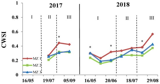 Seasonal course of crop water stress index (CWSI) of vines in the management zones during 2017 and 2018. Each point is the mean of 2031, 2126 and 1364 vine polygons for MZ 1, 2 and 3, respectively ± SE. The value of each replicate was the average of the lowest 33% of vine’s polygon. Asterisks represent significant differences among MZs using ANOVA (α = 0.05).