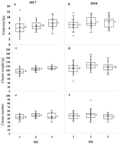 Boxplot of yield and fruit quality variables in the management zones (MZs) for 2017 (a,c,e) and 2018 (b,d,f): handpicked yield for 2017 (a) and 2018 (b); vine average cluster weight in 2017 (c) and 2018 (d) and vine average cluster number in 2017 (e) and 2018 (f). Data were collected from 240 measurement vines within the vineyard; MZ1—88 vines, MZ2—112 vines and MZ3—40 vines. Significant differences among MZs were calculated using ANOVA (α = 0.05). Different letters represent significant differences between MZs.