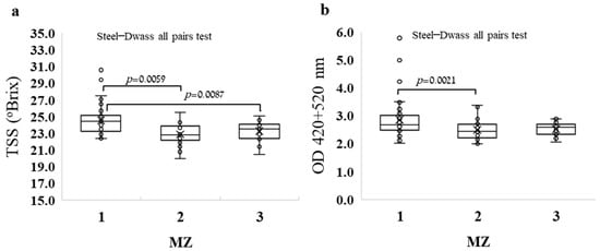 Whisker boxplot of (a) TSS and (b) fruit must color from the management zones (MZs) in 2018. Significant differences among MZs were calculated according to the Steel–Dwass test, lines with p-values indicate statistically significant difference (α = 0.05).