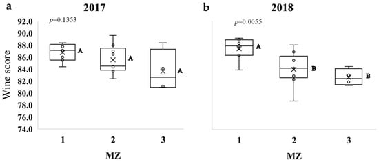 Whisker boxplot of wine scores in the (a) 2017 and (b) 2018 seasons, signifying the wine quality for the management zones. Each point is the mean of the winemaker’s evaluation of each of the 20 management cells. Significant differences among management zones (MZs) were calculated using ANOVA (α = 0.05). Different letters represent significant differences between MZs.