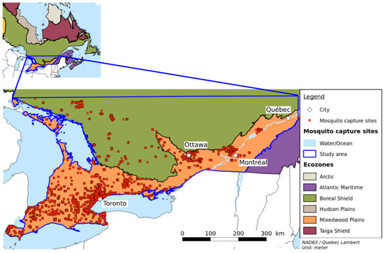The study area and mosquito capture sites. The study area is situated mainly in the Mixedwood Plains and the southern part of the Boreal shield.