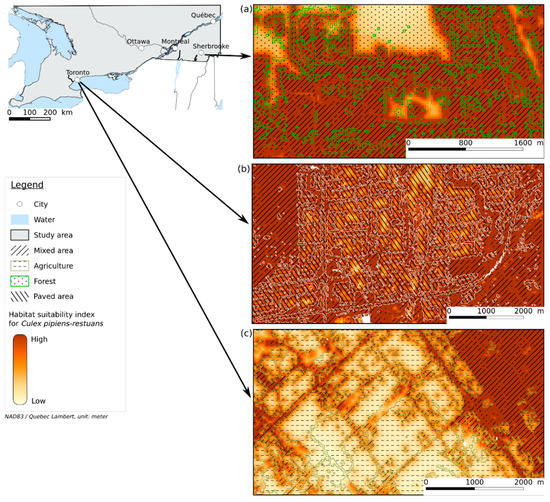 In [26,27] the HS of Cx. pipiens was observed or estimated with climatic variables across Canada. On their maps, the HSI is high on all the current study area, whereas north is mostly composed of forest and hydrological features (see in Figure A1 of Appendix A), a less favorable habitat for Cx. pipiens-restuans. These differences may be explained by the difference in spatial scale used in the three studies ([26,27] and this current study) and the fact that, with a finer spatial scale, as the one used here, it is possible to capture local variation of habitat suitability which is more adapted to target locally vector control activities.