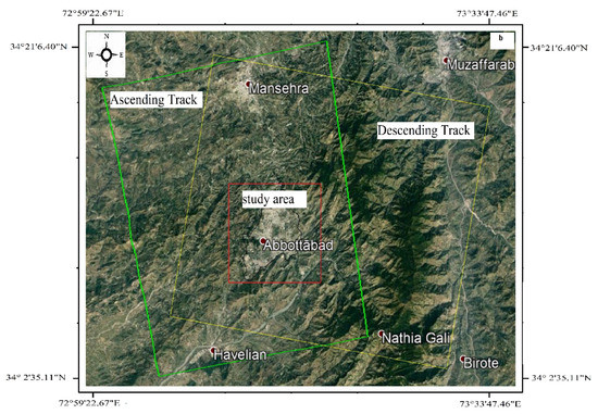 The geographical location of the study area (a), and area of interest with a footprint of the master area (both ascending and descending tracks) (b).