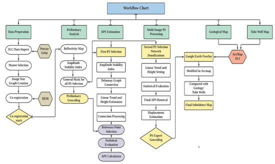 Our PSInSAR procedure involved data preparation, preliminary analysis, atmosphere phase screen (APS) estimation, and multi-image PS processing. The overall processing steps are given in Figure 3.