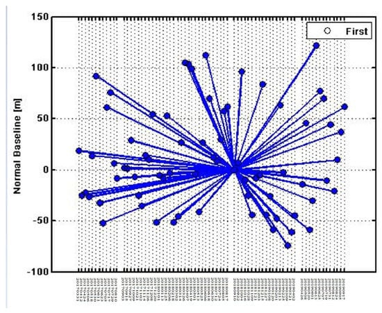 In data preparation, processing steps include importing single look complex (SLC) data with precise orbits. Here, images were selected with the same orbits, both ascending and descending. However, both ascending and descending images cannot be processed at the same time. In the following step, polarization of images was selected based on orbit information and slave and master images were selected. This was very important step, where orbit and track information were geo-located on Google Earth to remove SAR images of different tracks or area coverages. Images with less track difference were taken to reduce errors. At first, the master image was extracted covering the study area and then the slave images covering the same common area, according to the master image, were extracted. Here, a star graph between the master image and the slave image was created (Figure 4). During co-registration step a specific area has been considered and being co-registered [23].