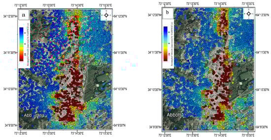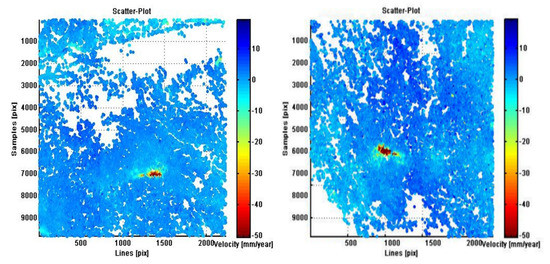 For the measurement of the motion along the line of sight (LOS), using PS points, it was observed that the movement away from the sensor was negative and is represented in the red. Other stable points that represent relatively no movement are located within the study area and are shown in Figure 5 (blue to light blue), points that showed comparatively high movement compared to the blue dots but a lower movement compared to red dots are marked as yellow to dark yellow and orange. The subsidence in Abbottabad was observed to be ranging from −25 to −50 mm/year (Figure 6). Scatter plot results show that there was an obvious subsidence in Abbottabad City.