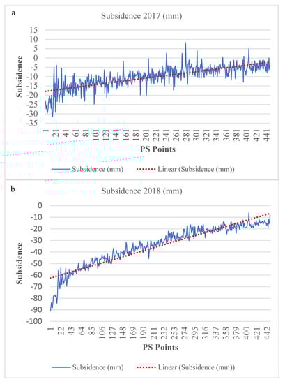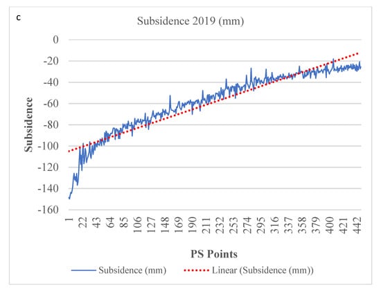 The final subsidence map obtained from both the descending (31 March 2017 to 17 September 2019) and ascending (10 February 2017 to 21 December 2019) tracks are visualized to determine subsidence trends of various PS points during the study time period (Figure 8). The graph in (a) in Figure 8 demonstrates the subsidence in the study area during 2017, which ranged from 0 to −30 mm per year. The graph in (b) in Figure 8 shows subsidence of the same PS points during 2018. There are notable fluctuations in the readings, but the average subsidence is nearly 18 mm per year during 2018. From Figure 8b we can see that the subsidence ranges approximately from −5 mm per year to −85 mm per year. During 2019, the range of subsidence was from −25 to −150 mm per year as shown in Figure 8c. These graphic representations show that the subsidence increased approximately −55 to −60 mm per year from 2017 to 2019.