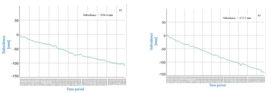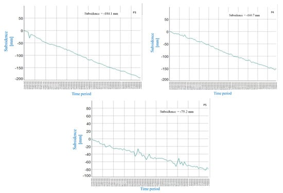 The subsidence area is shown with red dots in (Figure 9a,b). The obtained results highlight variations in the ground subsidence from place to place during the analysis periods. The subsidence along these points (P1, P2, P3, P4, and P5) are plotted in Figure 10. Here, P1 lies on southernmost part of the study area where subsidence reached −104.4 mm, points P2, P3, and P4 lie generally in the central part of the study area where subsidence reached −132.2 mm, −184.1 mm, and −160.7 mm, respectively, during the study analysis period. PS point P5 lies in the northern part of study area with a subsidence that reached −75.2 mm during the study time. It is obvious from the results that the subsidence was relatively higher in the central part of city, while it decreased towards northern and southern parts of the city.