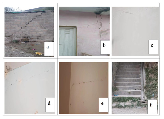 In Figure 13a, (a), (b), (c), (d), (e), and (f) represent various locations in the study area showing cracks in the walls of local houses, identified from field photos, as shown in Figure 14a–f. In Figure 13a, the doted circles mark three different locations where the photos were captured. The cracks found in local houses show that the study area experienced subsidence.