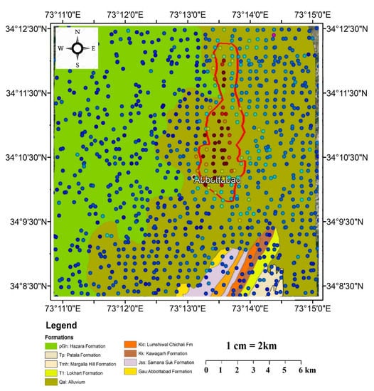 The main lithostratigraphic units in the study area are the Hazara Formation, Patala Formation, Margala Hill Formation, Lockhart Formation, Quaternary Alluvium, Lumshiwal Chichali Formation, Kawagarh Formation, Samana Suk Formation and Abbottabad Formation [41]. A geological map of Abbottabad is shown in Figure 2. Details of the lithological units are given in the sections below.