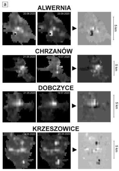 Figure 3 shows a map of illuminated roads in Cracow compared to the corresponding mean monthly VIIRS/DNB image for March 2020 [33,54]. Similar maps for all other analysed communes are provided in Appendix C (Figure A1 and Figure A2). The course of primary and secondary roads is visible in the VIIRS/DNB images.