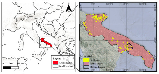 Apulia is the most southeastern region of Italy, geographically located between 39°47′29.8′′ N, 14°56′02.8′′ E and 42°08′25.5′′ N, 18°31′09.5′′ E (Figure 1). Encompassing a total area of 19,540 km2, Apulia has an average elevation of 565 m above sea level (a.s.l) (range: 0 m–1150 m a.s.l). Most of the region is characterized by flat and hilly landscape while the mountainous areas are limited to the north. It is characterized by hot summers and mild winters, which are typical of the Mediterranean climate. Annual rainfall is concentrated in fall and winter, while summers are typified by long periods of drought. The average annual rainfall varies from 450 mm to 650 mm. The mean annual temperature ranges from 12.0 °C for inland areas (i.e., Daunian Subappenines and Gargano Promontory) to 19.0 °C along the coasts.