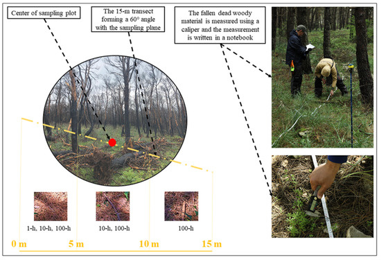 Field sampling protocol. Example of a field plot with a schematic transect (left). Operators measuring dead woody material with a caliper during a field survey campaign (right).