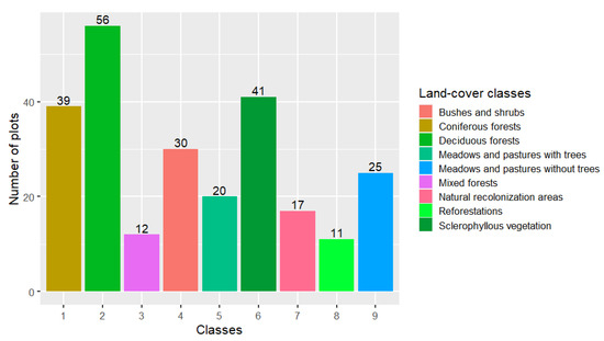 Elevation data were obtained from the 8-m DEM of the Apulia region, downloaded from the Territorial Information System platform (http://www.sit.puglia.it, accessed on 23 February 2021). The slope (degree) and easterness (i.e., sin of the aspect) raster were produced from the DEM. The mean value of each geomorphological variable was extracted using field plots in GIS. For each plot, the information concerning the land-cover was derived from the land-use map (2011) provided by the regional government. Nine land-cover classes were extracted using the field plots (Figure 3). A total of 107 field plots were counted in forest areas, 56 of which are in deciduous forests, 39 in coniferous forests, and 12 plots in mixed forests. Shrublands, consisting of sclerophyllous vegetation, bushes, and shrubs, were divided into a total of 71 plots. Lastly, 45 plots were classified as meadow and pasture areas, with or without the presence of trees, while the remaining 28 plots fell into areas classified as natural recolonization and reforestation areas.