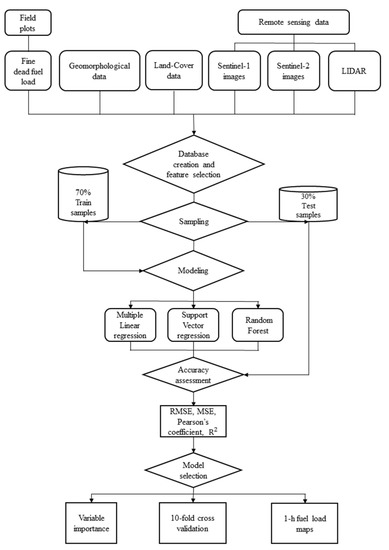 Therefore, new methods need to be developed to regularly estimate fuel parameters across multiple scales and vegetation types. This gap has been partially filled by the growing availability of new sensors and remote sensing detection capable of providing data for modeling live and dead fuel load estimates. In light of the above, a number of authors [23,24,25,26,27,28,29] have attempted to estimate vegetative fuel loads using different remote sensing predictors. For example, Saatchi et al. [27] employed radar data (i.e., Synthetic Aperture Radar) to measure the distribution of forest biomass and canopy fuel loads in Yellowstone National Park (USA). Liu et al. [28] developed a methodological framework to estimate the forest stand mean height and above-ground biomass in China by integrating field plots, Sentinel imagery, as well as topographic and geographical data. Skowronski et al. [30] used aerial photography, airborne laser scanning, and cadastral datasets to test a reliable method for characterizing fuel loads at a local scale in New Jersey (USA). Queiroz et al. [31] presented a methodology to map coarse woody debris in the boreal forest of Alberta (Canada) using optical imagery and an infra-canopy vegetation-index layer derived from LIDAR.