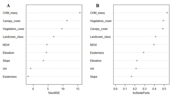 Variable importance of the Random Forest model for 1-h fuel load estimation measured by (A) the percentage increase in Mean Squared Error (%IncMSE) and (B) increase in node purity (IncNodePurity). Abbreviations are: Easternness = Easterness of each plot, VH = VH polarization, Slope = Slope in each plot, Elevation = Elevation of each plot, NDVI = Normalized Difference Vegetation Index, Landcover_class = Land-cover class in each plot, Vegetation_cover = Vegetation cover, Canopy_cover = Canopy cover, and CHM_maxq = Canopy Height Model 95th percentile.