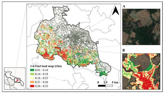 Our results may be applied regardless of the specific landscape context since our study has suggested a method to understand where the fine dead fuel is more likely to accumulate. According to the map in Figure 6, the areas associated with a high quantity of 1-h fuel load were found in forests, while this quantity radically decreased in meadow and pasture areas. This is most likely related to the fact that if the ecosystem complexity increases, in terms of biomass and vertical structure, the 1-h fuel load also increases and, hence, the likelihood of ignition. In this regard, quantitatively estimating the fuel load and knowing its spatial distribution could have great practical significance, thus allowing the prioritization of silvicultural interventions within fire management and mitigation plans [75,76]. In a context where resources are often limited and local and national authorities focus their efforts solely on fire suppression [77], our approach could create the basis for planning new preventive policies and budgeting financial resources.