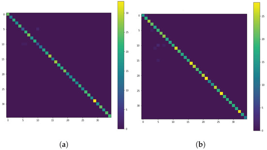 Confusion matrices for the RSI-CB256 dataset: (a) validation. (b) testing.