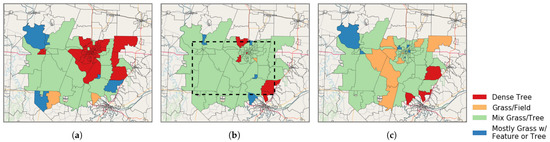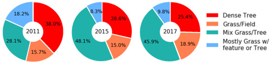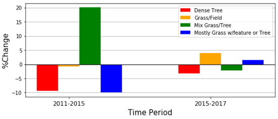 The percentages of the temporal change per cluster in the whole study area for the two time periods, 2011–2015 and 2015–2017, are shown in Figure 5. Some clusters increased while some other decreased. For instance, during the period 2011–2015, three clusters, dense tree, grass/field, and mostly grass w/features decreased by about 9.34%, 0.71%, and 9.95%, respectively; while mix grass/tree increased with the percentage of 20%. Additionally, it can be seen there is a small change during the time period 2015–2017 compared to the other period since it is a smaller temporal window. The figure clearly shows that the dense tree cluster, unlike the other clusters, constantly decreases in both periods; which can be expected in a study area such as this with expanding suburban characteristics encroaching on undeveloped rural areas.