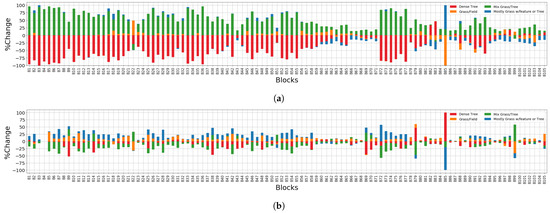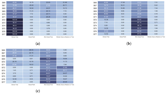 Figure 4 shows a sample of the percentage of each cluster per block in the three years 2011, 2015, and 2017. In Figure 4a, the top six blocks represent a diverse cluster with a strong Dense Tree and then transitional areas of grass and trees; and the lower six blocks are a cluster that is dominated by Dense Tree. In Figure 4b, the top six blocks represent a diverse cluster with mostly Dense Tree and Mix Tree/Grass; and the lower six blocks are a cluster that visually exhibits mostly areas of Mix Grass/Tree and little to no open grass fields. In Figure 4c, the top six blocks represent a diverse cluster with mostly Mix Tree/Grass and little of Dense Tree and Grass/Field; and the lower six blocks are a cluster that visually exhibits mostly areas of Mix Grass/Tree and little of Mostly Grass w/feature or Tree.