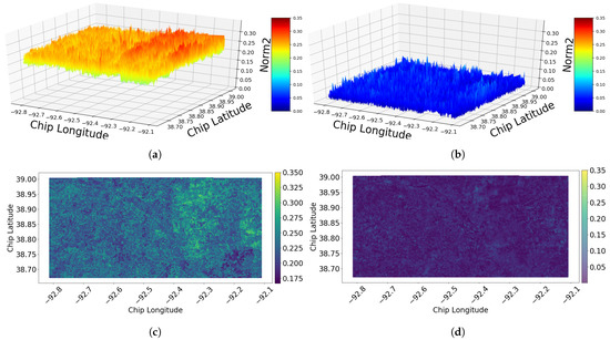 Norm2 of the change based on the chip-level utilizing neighborhood method of (M-N) during two different time periods: (a) 3D (2011–2015). (b) 3D (2015–2017). (c) 2D (2011–2015). (d) 2D (2015–2017).