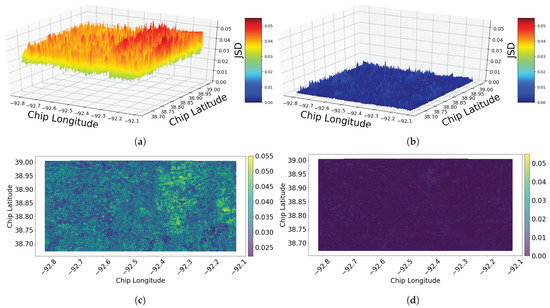 Jensen–Shannon divergence (JSD) of the change based on the chip-level utilizing neighborhood method of (M-N) during two different time periods: (a) 3D (2011–2015). (b) 3D (2015–2017). (c) 2D (2011–2015). (d) 2D (2015–2017).