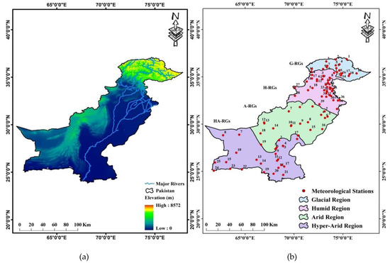 Pakistan is geographically situated in western South Asia between 23.5° and 37.5° N and longitude 62° to 75° E and covers an area of 803,940 km2 (Figure 1a). The elevation of Pakistan ranges from 8600 m at Hindukush–Himalaya (HKH) mountain ranges situated in the extreme north to 0 m at the coast of the Arabian Sea located at extreme south [41,66]. Pakistan shares its boundaries with China (north), Afghanistan (west), Iran (west), and India (east) [18,67]. Pakistan has a very diverse climate ranging from glacial to humid, arid, and hyper-arid regions with extreme north to south trends. According to climate variability, the study area is divided into glacial, humid, arid, and hyper-arid regions (Figure 1b).