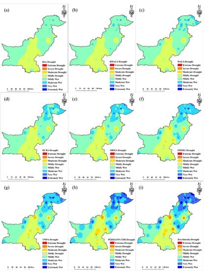 Spatial distribution drought (SPI-3) across Pakistan during pre-monsoon season in the representative drought year (2008), (a) RGs, (b) RWALS-MSPD, (c) WALS-MSPD, (d) DCBA-MSPD, (e) DBMA-MSPD, (f) IMERG, (g) TMPA, (h) PERSIANN-CDR, and (i) ERA-Interim.