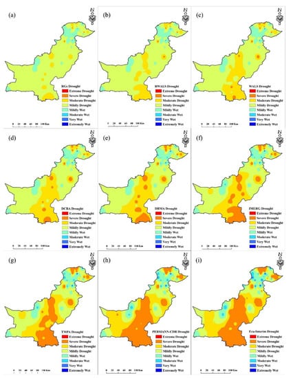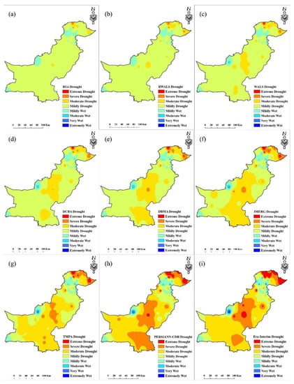 Spatial distribution drought (SPI-3) across Pakistan during winter season in the representative drought year (2008), (a) RGs, (b) RWALS-MSPD, (c) WALS-MSPD, (d) DCBA-MSPD, (e) DBMA-MSPD, (f) IMERG, (g) TMPA, (h) PERSIANN-CDR, and (i) ERA-Interim.