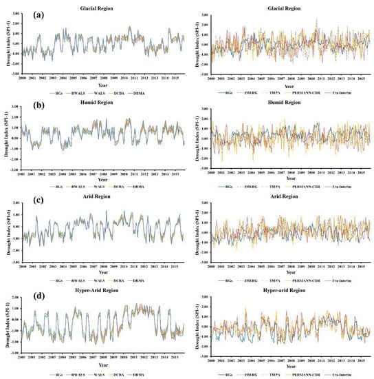(a–d) SPI-1 drought index estimated using RGs and MSPDs (left panel) and SPDs (right panel) across all four climate regions.
