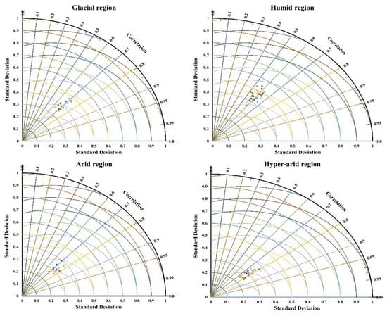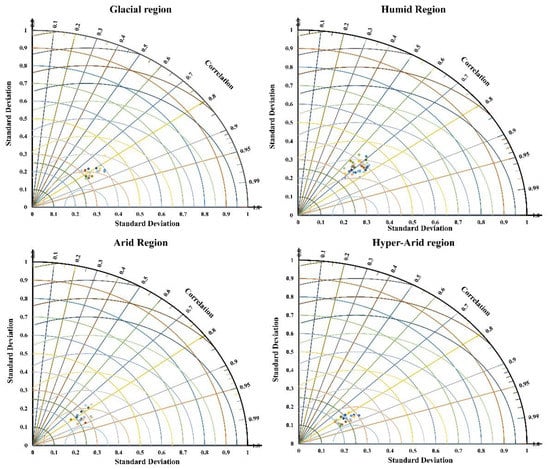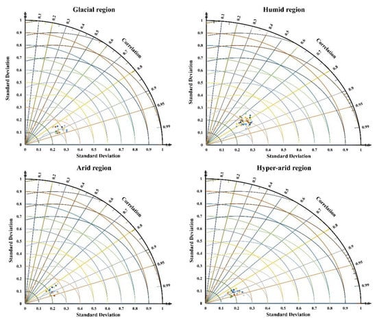 The Taylor diagram is used to represent the spatial variability (using standard deviation and correlation between SPDs/MSPDs and RGs) of SPI time-series across each climate region. Figure 8 shows the spatial variability of the SPI-1 time-series of RWALS-MPSD against every RG in each climate region. The results depict a relatively high magnitude of standard deviation (STD) and low correlation (R) in the humid region with average values of 0.50 and 0.65, respectively. The STD/R for RWALS-MSPD in the glacial and arid regions are 0.65/0.74 and 0.56/0.80, respectively. Comparatively, lower deviation and the highest correlation between RWALS-MSPD and RGs are observed in the hyper-arid region with average values of 0.49 and 0.82, respectively. It should be noted that no significant spatial variability has been observed within the RGs/pixels in each climate region.