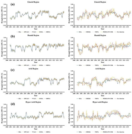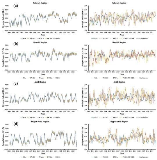 The regional-scale assessment shows that the glacial region has mild drought conditions, with few exceptions showing moderate drought. The regional average SPI-3 values for RGs, RWALS, WALS, DCBA, DBMA, IMERG, TMPA, PERSIANN-CDR, and ERA-Interim across the glacial region are −0.34, −0.41, −0.50, −0.58, −0.66, −0.74, −0.81, −0.90, and −0.95, respectively. The severity of drought is relatively high in the humid region as compared with the glacial region. The maximum and minimum RG-based SPI-3 drought values of the humid region are −0.87 and −0.26. The average regional SPI-3 values are −0.78, −0.89, −0.98, −1.10, −1.22, −1.34, −1.46, −1.61, and −1.76 for WALS, DCBA, DBMA, IMERG, TMPA, PERSIANN-CDR, and ERA-Interim, respectively.