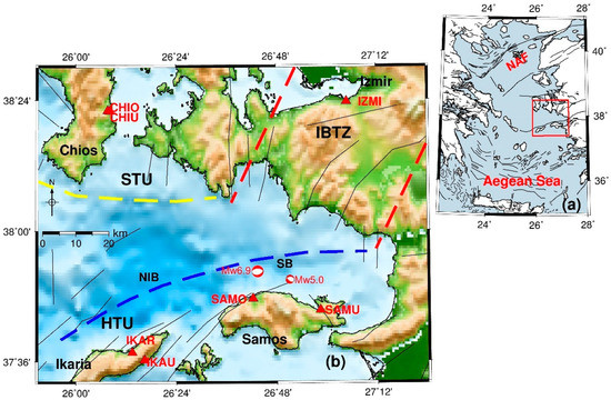 (a) Index map and (b) relief map of the broader area of Samos, which shows the location of continuous Global Navigation Satellite System (GNSS) sites that were used in this study (red triangles), together with the focal mechanism solutions of the Mw6.9 earthquake and its major aftershock. Faults (black lines) were taken from [15,16,17,18]. Red dashed lines define the Izmir Balikesir Transfer Zone (IBTZ); yellow dashed line marks the Sakarya Tectonic Unit (STU); blue dashed line defines the Hellenides Tectonic Unit (HTU); NIB: North Ikaria Basin; SB: Samos Basin; NAF: North Anatolian Fault zone.