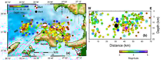 Real-time waveform data from the Hellenic Unified Seismological network were used for the seismological analysis, together with data from other available seismological networks in the area [25,26,27]. The hypocenters were initially located by using the HypoInverse code [28] and a custom velocity model that was formed for this sequence, which started with a 1-D model for the region of Karaburun (Erythres), Turkey [24,29]. The hypocenters presented herein are relocated events that were extracted using the double-difference method HypoDD [30]. Further details of the processing procedure are found in [19].