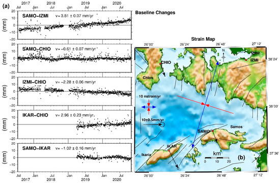 Baselines changes between the four local GNSS stations were compiled to assess local deformation prior to the earthquake (Figure 4a). Moreover, differential velocities were calculated relative to station IZMI, and the regional strain field was estimated (Figure 4b). It is noted that station IKAR was only briefly operating before the earthquake (being established on 1 April 2019). However, its calculated velocity vector is in agreement with another station on Ikaria (belonging to Hellenic Cadaster), where data were available for the period from 2013 to 2017. The pre-earthquake deformational field confirms the extensional dynamic conditions of the area [1,8,42].